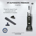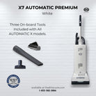 AUTOMATIC X models are the most technically advanced and uniquely easy-to-use vacuum cleaners in the world! Available in two power head widths, the 12-inch X7 and 15-inch X8 feature truly automatic height adjustment, an LED headlight, and an extra layer of micro-filtration. An electronic controller measures the resistance of the spinning brush roller against the floor surface and then signals up or down adjustments, to ensure optimal performance on both carpets and hard floors. The user is alerted to clogs, a worn brush, or a full bag, and the vacuum automatically shuts off when brush obstructions occur. The X7 and X8 also have an instant-use cleaning wand and suction hose, a lifetime belt warranty, tool-free brush roller removal, a 40-foot power cord, three on-board attachments, and excellent pet hair removal.