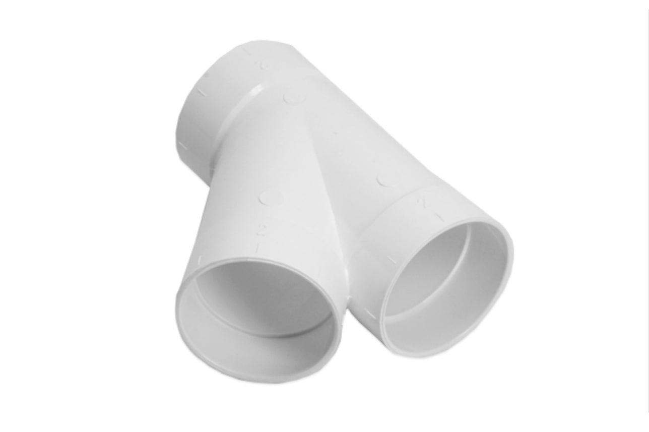 We usually recommend using a 90 Degree Sweep Tee when connecting to a trunk line, but if space is an issue, you can use this 45 Degree Wye "Y" fitting. This fitting is used for connecting two PVC pipes through a straight coupling with the third entering at a 45-degree angle. Always make sure you install it in the correct airflow position to avoid clogs.