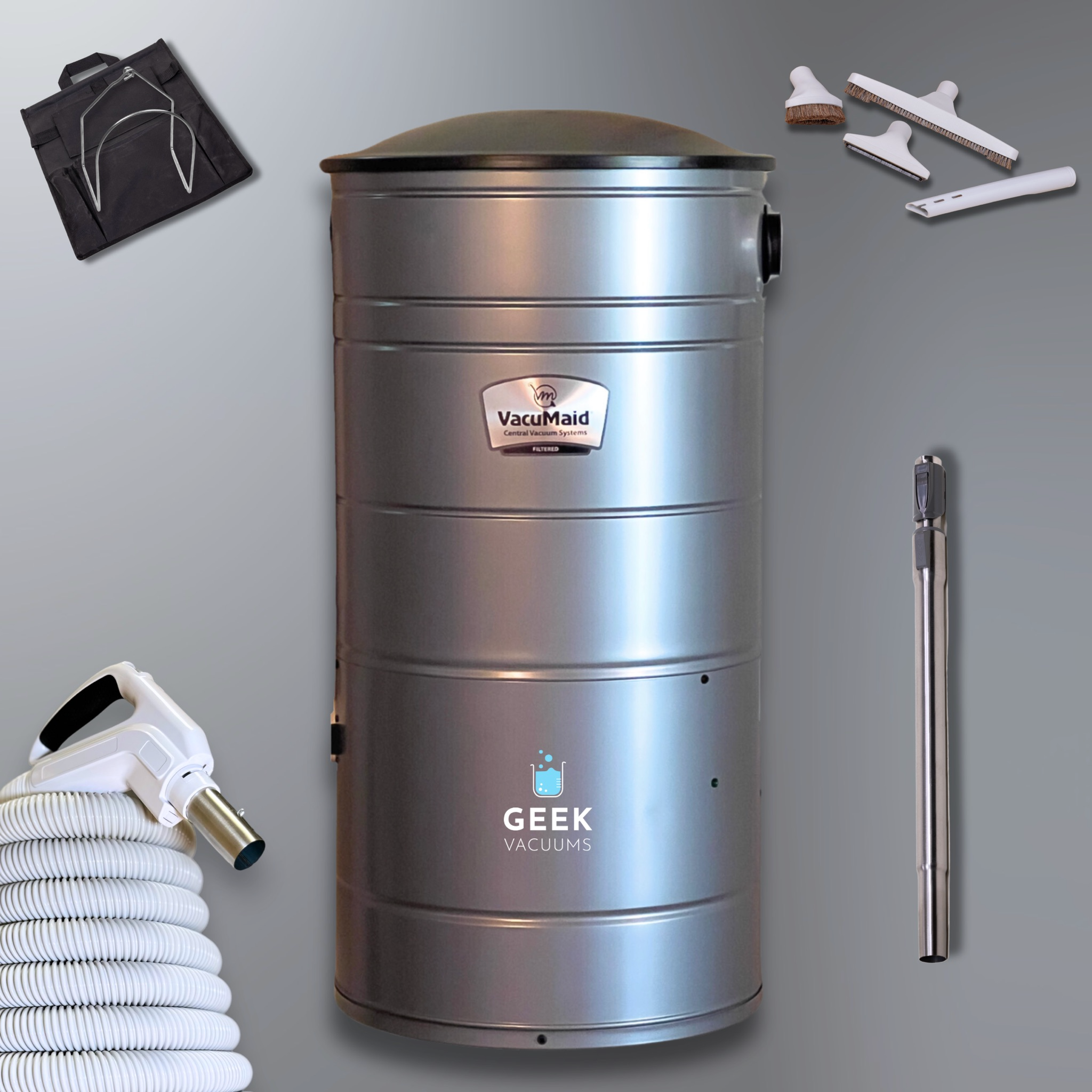 Vacumaid SR 800 Central Vacuum High Power Unit The largest central vacuum that Vacumaid produces, making it ideal for cleaning any large home, business, vets office, or hair salon up to 12,000 square feet in size. The Ametek Lamb high air watt 8.4” 2-stage tangential bypass motor will leave nothing behind. Designed to last, this unit features durable steel construction and comes with a 10-year warranty. The SR800 utilizes a 38 Qt. HEPA bag to remove 100% of dirt, dust, and other allergens from the air through a two-layer disposable bag. The inner liner acts as an electrostatic barrier, giving the bag added strength, and reducing the chance of bursting. The SR800 is made in the USA and is a must-have for a Hide-a-Hose system.
