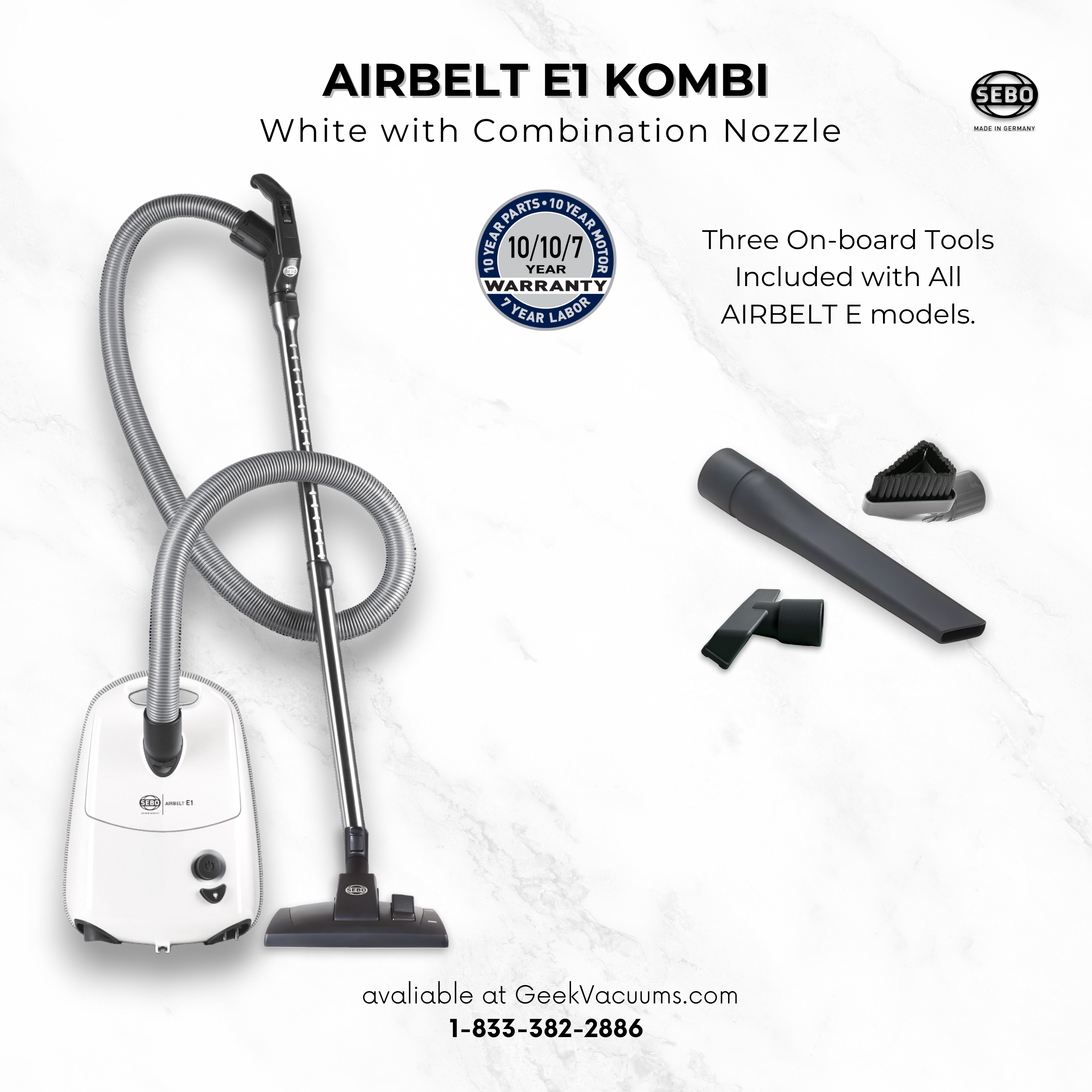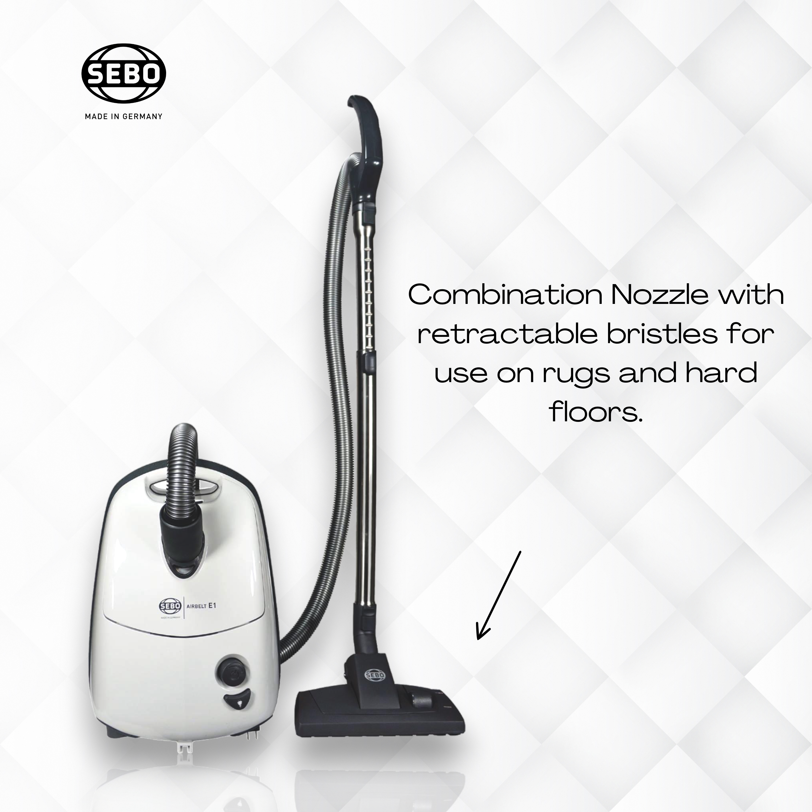The SEBO Airbelt E1 Kombi combines power and convenience to provide a superior cleaning experience. Whether you're dealing with hard floors or rugs, this vacuum has you covered easily and efficiently. Here's what makes the E1 Kombi stand out: