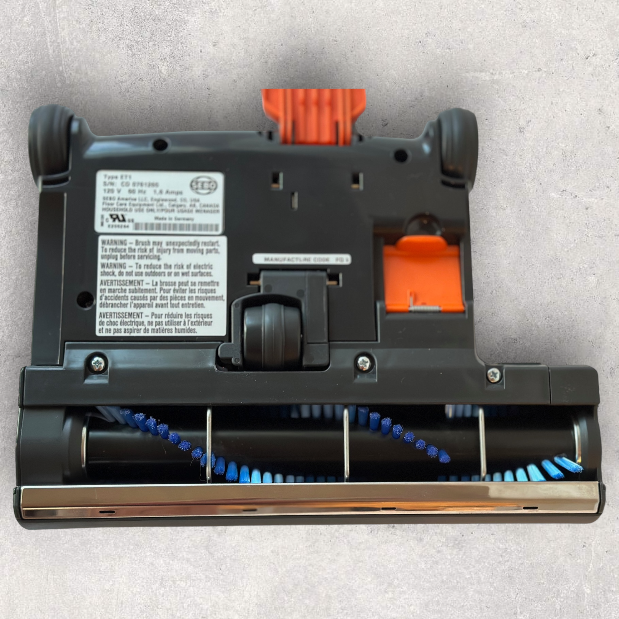 EASY BRUSH ROLLER REMOVAL, USER WARNING LIGHTS, AND AUTOMATIC OBSTRUCTION SHUT-OFF: The ET-1 power head features tool-free brush roller removal, a convenient clog removal door, and a red warning light that triggers an automatic shutdown if the brush roller jams or gets obstructed. Additionally, this warning light stays on to indicate when the brush height is too high for effective cleaning or when the brush roller needs replacing due to worn bristles.